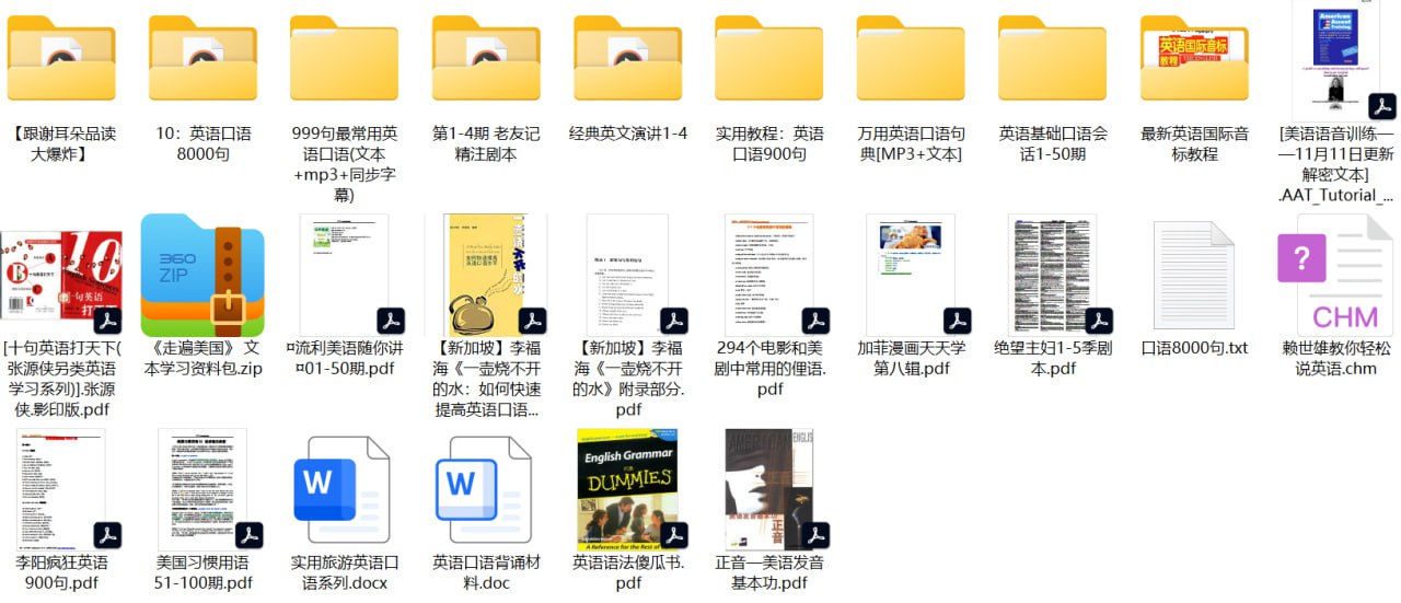 该英语口语学习资料包整合了多维度的实用资源,包含:1)场景化表达素材如《英语口语8000句》《999句最常用英语口语》及《万用英语口语句典》,覆盖日常生活、旅行、职场等200+细分场景;2)发音专项训练含《最新英语国际音标教程》和《美语语音训练》,配套对比纠音指导;3)文化习得类资料如《绝望主妇》剧本、《老友记精注剧本》及294个影视俚语,帮助理解真实语境;4)方法论书籍如李阳疯狂英语900句、李福海《一壶烧不开的水》提供学习策略;5)拓展素材包括经典英文演讲音频文本、加菲漫画等趣味内容。所有资源均配有MP3音频,支持跟读训练。