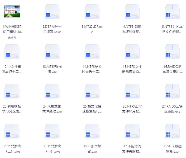 ├── 1.WINHEX的使用精讲 38分钟.wmv 148.95M ├── 2.DBR损坏手工填写1.exe 11.77M ├── 3.MT加LDR.exe 3.54M ├── 4.NTFS-DBR损坏的恢复方法.exe 3.47M ├── 5.NTFS分区正常文件的提取.exe 9.00M ├── 6.RAID02K四块盘重组.exe 19.10M ├── 7.操作系统读取数据过程的模拟.exe 20.58M ├── 8.单分区手工填写.exe 1.45M ├── 9.两分区手工填写.exe 1.90M ├── 10.NTFS未格式化故障处理.exe 4.42M ├── 11.文件或文件夹删除恢复技巧.exe 37.48M ├── 12.小文件删除后纯手工恢复.exe 1.51M ├── 13.MT逻辑扫描.exe 5.20M ├── 14.NTFS多分区丢失手工恢复.exe 9.27M ├── 15.NTFS文件删除恢复原理 .exe 7.08M ├── 16.RAID0XP三块盘重组.exe 10.53M ├── 17.RAID0双盘重组.exe 7.29M ├── 18.格式化快速恢复技巧.exe 6.45M ├── 19.三分区手工填写.exe 9.63M ├── 20.文件或目录损坏故障处理.exe 4.86M ├── 21.误格式化恢复软件对比.exe.exe 131.02M ├── 22.虚拟磁盘的创建.exe 1.06M ├── 23.利用模板填写分区表.exe 1.38M ├── 24.未格式化故障处理.exe 6.11M ├── 25.格式化快速恢复技巧2.exe 5.58M ├── 26.NTFS正常文件碎片提取过程.exe 5.74M ├── 27.RAID0三块盘重组.exe 6.07M ├── 28.MT写固件过程.exe 7.55M ├── 29.用R-STUDIO恢复误克隆的数据.exe 18.78M ├── 30.多分区手工填写.exe 19.52M ├── 31.NTFS分区格式化恢复技巧.exe 19.75M ├── 32.根据FDT提取正常文件.exe 21.82M ├── 33.文件名乱码的恢复案例 8分钟.avi 20.12M ├── 34.11代解密(上).exe 2.71M ├── 35.11代解密(下).exe 20.83M ├── 36.ST加密解密.exe 4.93M ├── 37.不能访问文件夹的数据恢复.exe 14.99M ├── 38.SD卡数据恢复.exe 13.56M ├── 39.优盘未格式化的数据恢复 24分钟.avi 80.34M ├── 40.分区提示格式化案例.avi 18.83M ├── 41.U盘提示格式化复杂案例.avi 55.39M ├── 42.FAT32分区全盘乱码恢复方法.exe 20.92M ├── 43.NFTS快速格式化恢复.exe 155.18M ├── 44.WINHEX脚本讲解及演示(视频).avi 14.67M ├── 45.exfat文件系统手工重建DBR视频1.exe 7.68M ├── 46.exfat文件系统手工重建DBR视频2.exe 10.94M ├── 47.SQL2000碎片恢复实战视频(1).avi 26.79M ├── 48.SQL2000碎片恢复实战视频(2).avi 19.93M ├── 49.多DataRuns计算器使用视频1.avi 99.57M ├── 50.U盘文件乱码恢复.exe 7.38M ├── 51.文件破坏后的修复1.avi 16.09M ├── 52.文件破坏后的修复2.avi 19.41M ├── 53.SQL2000碎片恢复实战视频(3).avi 19.93M ├── 54.原盘分区未破坏只要少量数据用DE恢复方法2.exe 3.84M ├── 55.DE对考.exe 3.04M ├── 56.用DE也能恢复删除的文件不过没有文件名.exe 2.91M ├── 57.FINALDATA数据恢复.exe 5.35M ├── 58.易我分区表医生.exe 3.40M ├── 59.R-STUDIO使用.exe 7.26M ├── 60.WIN下硬盘检测HDDSCAN.exe 6.27M ├── 61.WIN下硬盘检测VT.exe 2.45M ├── 62.数据库定位.exe 3.81M ├── 63.调整分区后的数据丢失.exe 24.02M ├── exfat文件系统手工重建DBR视频.txt 0.00M └── 视频密码.txt 0.00M