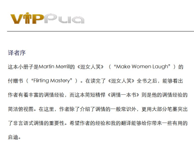 这本小册子是Martin Merrill的《逗女人笑》(“Make Women Laugh”)的付赠书(“Flirting Mastery”)。在读完了《逗女人笑》全书之后,能够看出作者有着丰富的调情经验,而这本简短精悍《调情一本书》则是他的调情经验的简洁俯视图。在这里,作者除了介绍了调情的一般常识外,更用大部分笔墨突出了非言语式调情的重要性。希望作者的经验和我的翻译能够给你带来一些有用的启迪。